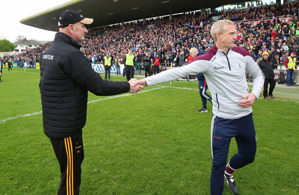 Brian Cody, directeur de Kilkenny, et Henry Schifflin, directeur de Galway, se serrent la main après le match.