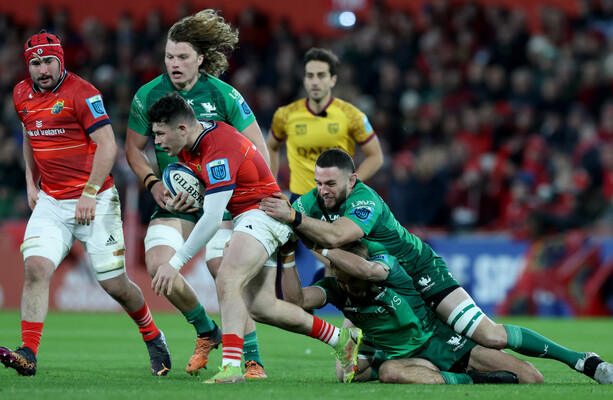 Ils l’ont tenu pendant environ 16 minutes, un grand moment arrivant à 18 minutes lorsque Munster a défendu avec succès une attaque du Connacht sur leur propre ligne de cinq mètres, finissant par sortir le ballon après un vol astucieux de Kindlin.