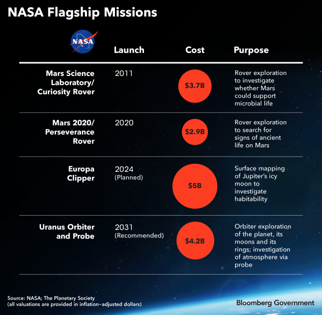 Le même groupe a recommandé le dernier projet phare de la NASA en 2011, une mission de 5 milliards de dollars sur la lune de Jupiter dont le lancement est maintenant prévu en 2024. Les missions majeures précédentes ont envoyé des rovers sur Mars et balayé le système solaire avec des sondes.