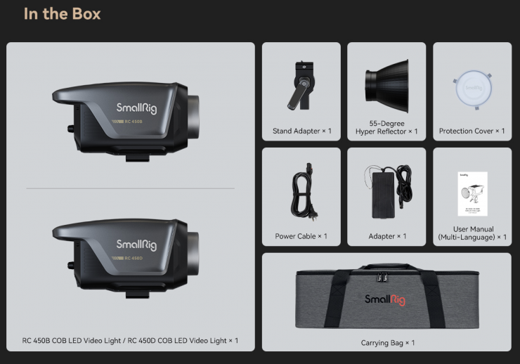 SmallRig affirme qu’à 1 mètre / 3,3 pieds avec un réflecteur extrême à 55 degrés, les lampes vidéo RC-350B / RC-450B produisent 115 000/121 000 lux. Avec un super réflecteur de 55°, le RC 350D émet 149 000 lux à 1 mètre / 3,3 pieds, tandis que le RC 450D produit 172 000 lux.