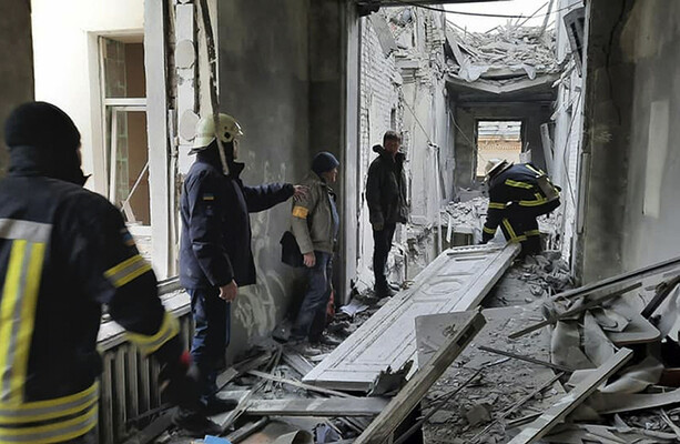 Le personnel des services d’urgence ukrainiens travaille à la place dans le bâtiment endommagé de l’hôtel de ville de Kharkiv après l’attentat de ce matin